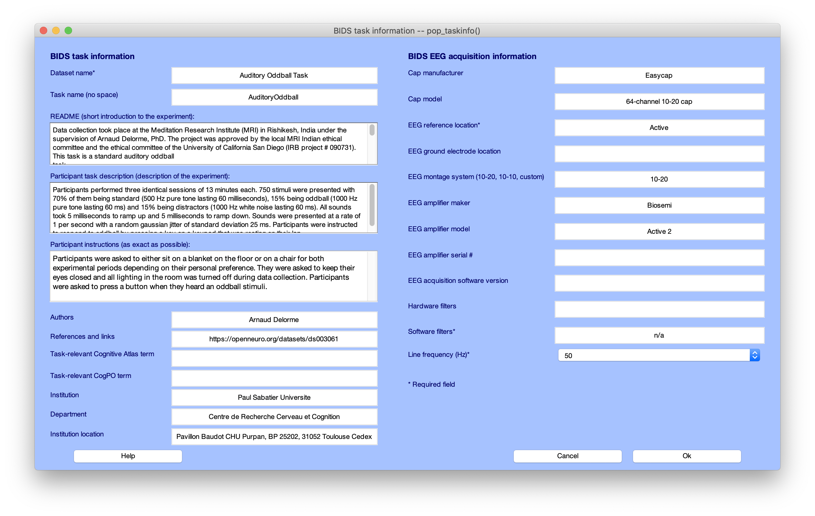 データセットをBIDSにエクスポートすることで、コマンドラインから簡単に行えます。 文書化された例のスクリプト bids_export_example.m そして、 bids_export_example2.m (詳細はこちら) これらのスクリプトを自分の目的に合わせて変更することができます。 機能のヘルプメッセージ 入札_export.m また、BIDS形式のデータをエクスポートする方法に関する情報が含まれています。