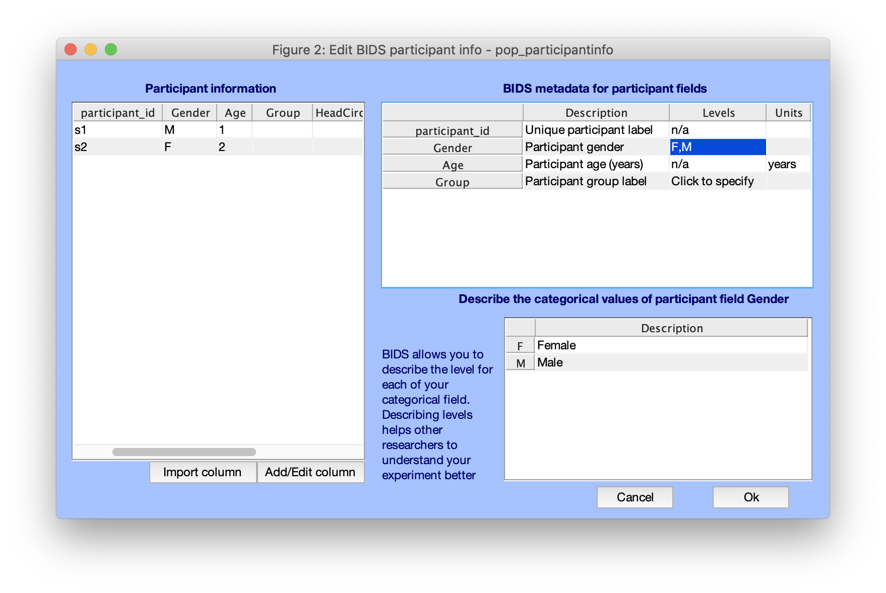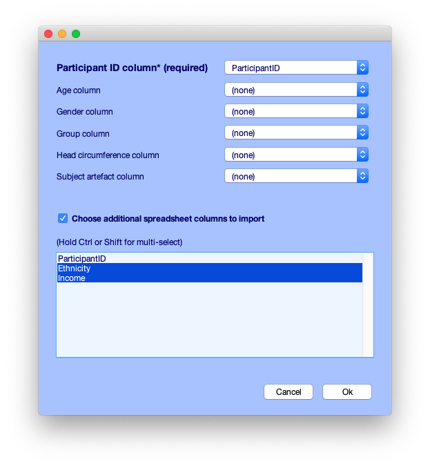 参加者 ID が含まれている列を示す必要があります。 また、年齢、性別などの事前定義されたBIDS参加者情報用の列を選択することもできます。 最後に、BIDS参加者ファイルに追加された列を選択し、この場合「エシニティ」と「インカム」を選択します。
