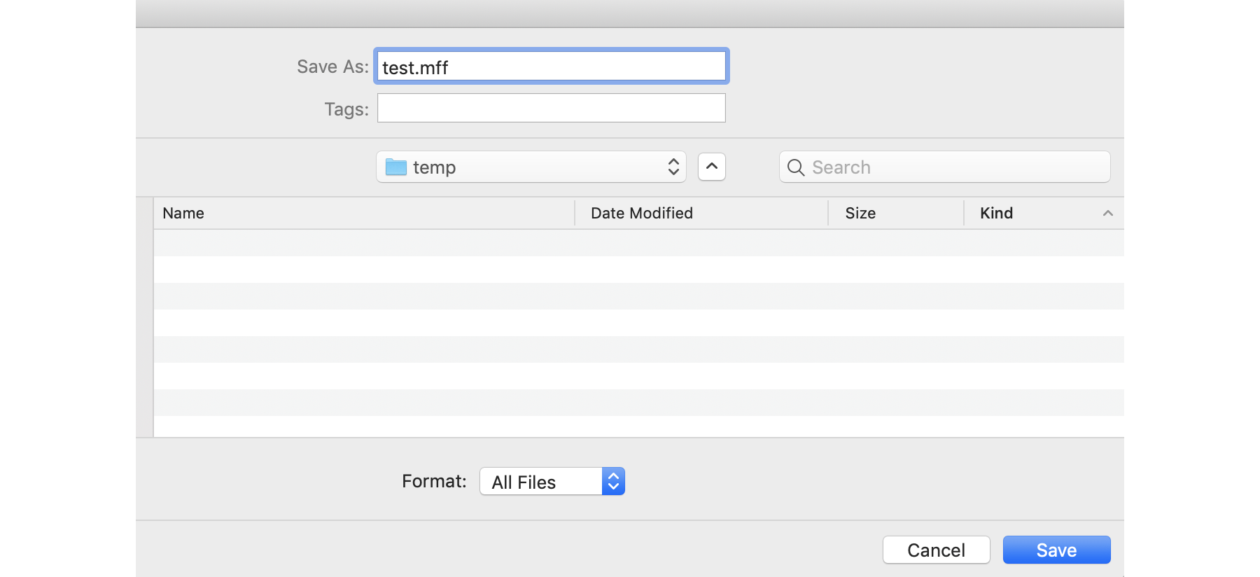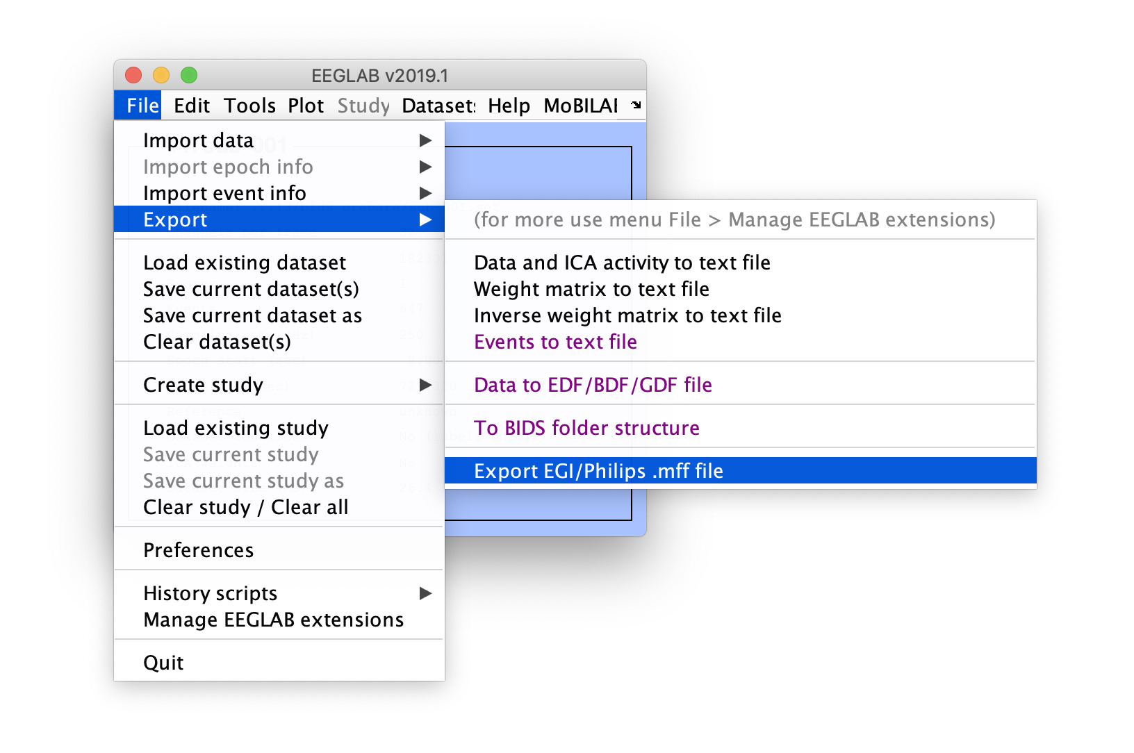 データファイルをMFF形式にエクスポートするには、メニュー項目File > エクスポートデータ > エクスポート Phillips/EGI .mff ファイル.