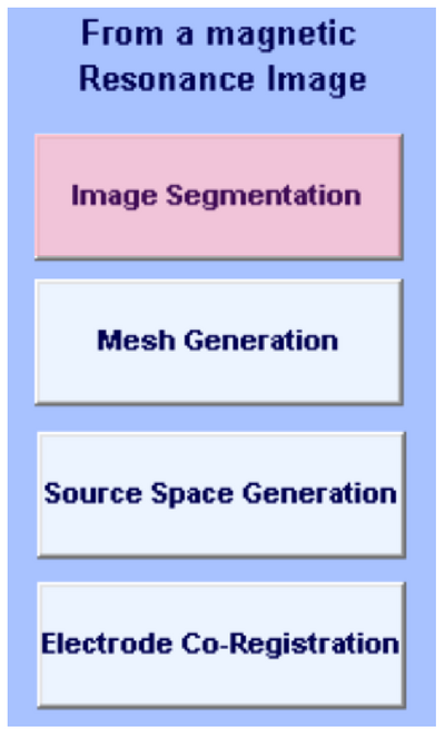 ヘッドモデリングのステップは、セグメント化、メッシュ生成、および スカルプ面での電極位置の共同調整。 ご利用者様も 逆の溶液で使用するソーススペースを生成します 問題。 図2では、MR画像を用いたヘッドモデリングの手順を示します。
