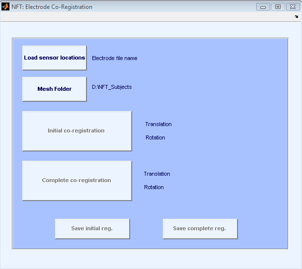電極の共同登録モジュールへの入力は電極です 場所。 被写体のスカルプメッシュが自動的にロードされ、 電極はスカルプメッシュに共同登録されます。 共同登録 2つのステップで行います。 ユーザが手動でセンサーを共同登録する 初期登録ボタンを押します。 EEGLABの始まり 共同登録機能および粗い登録は持って来るために行われます メッシュ座標系へのセンサー 第2ステップは完了です 共同登録。 このステップは、初期の共同登録から始まり、 最高の翻訳と回転パラメータを自動的に見つける センサーとスカルプ面のトータル距離を最小化。