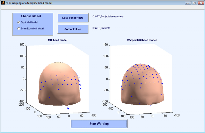 ワーピングは、表面に基づいて計算されます: 陰と左と 正しい項目のポイント。 これらの3ポイントを使用して、別のポイントは テンプレートモデルの先頭に計算され、 被験者の電極の位置。 これらの4ポイントを使用して、センサー 位置とヘッドモデルが同じ座標系に持ち込まれています。 アフター この初期の共同登録、ヘッドモデルと両方の19のランドマーク センサーはあります。 これらのランドマークは、ワーピングを見つけるために使用されます パラメータ。 ワーピング方式は、非厳格な薄版スプライン方式です。 頭皮、すべての表面および源のためのゆがみを見つけることの後で スペースは同じゆがみパラメータを使用して警告されます。