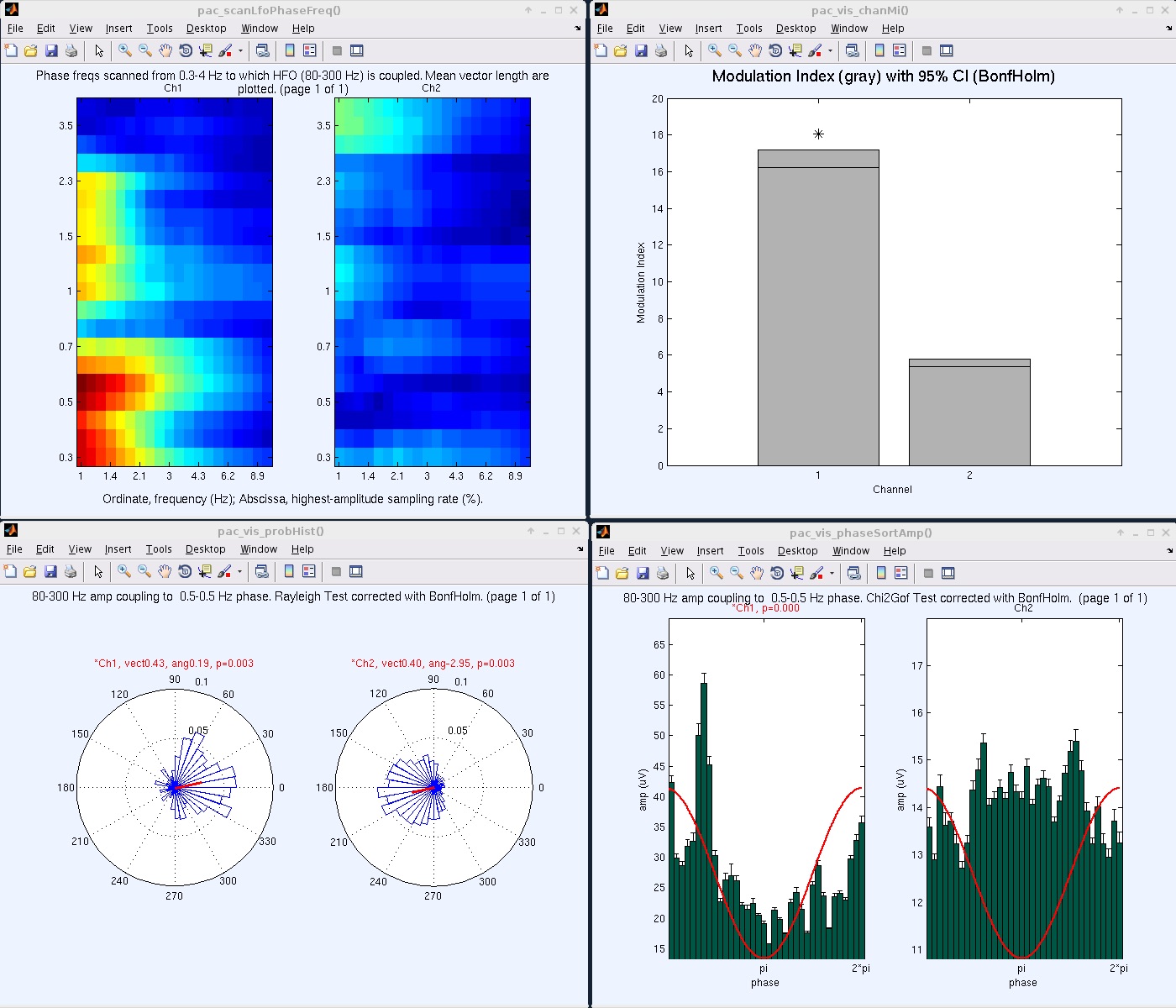 以下の例では、Ch21が最も強いことを容易に見つけることができます 間のPAC 3Hz段階および80-Hz HFOの広さは、Ch16によって続きます。 チャレンジャー18 また、いくつかのPACを示しましたが、それは3つのHzの代りに1.7のHzと結合しました 何か違うかもしれない。 1 つを選択すると、ベクトルの長さが表示される Canoltyの変調指数(MI)の代わりに、それは評価することができます HFOの振幅の影響なしで同じ測定。 計算された値 EEG.pacScanの下に保存されます。