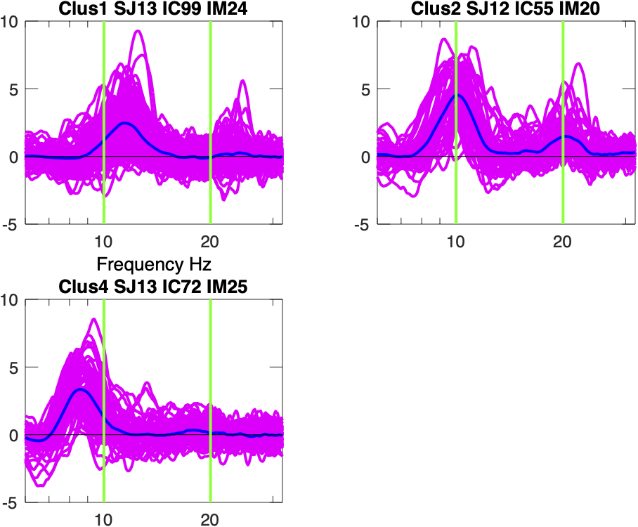 ここでは、アルファ周波数帯でピークを持っているクラスタリングのためのスペクトルテンプレートを収集 [8 12] Hz は、10 Hz の ‘targetpeakfreq’ に spectra を warp することを選びます。 収集したテンプレートのプロットを選択します。