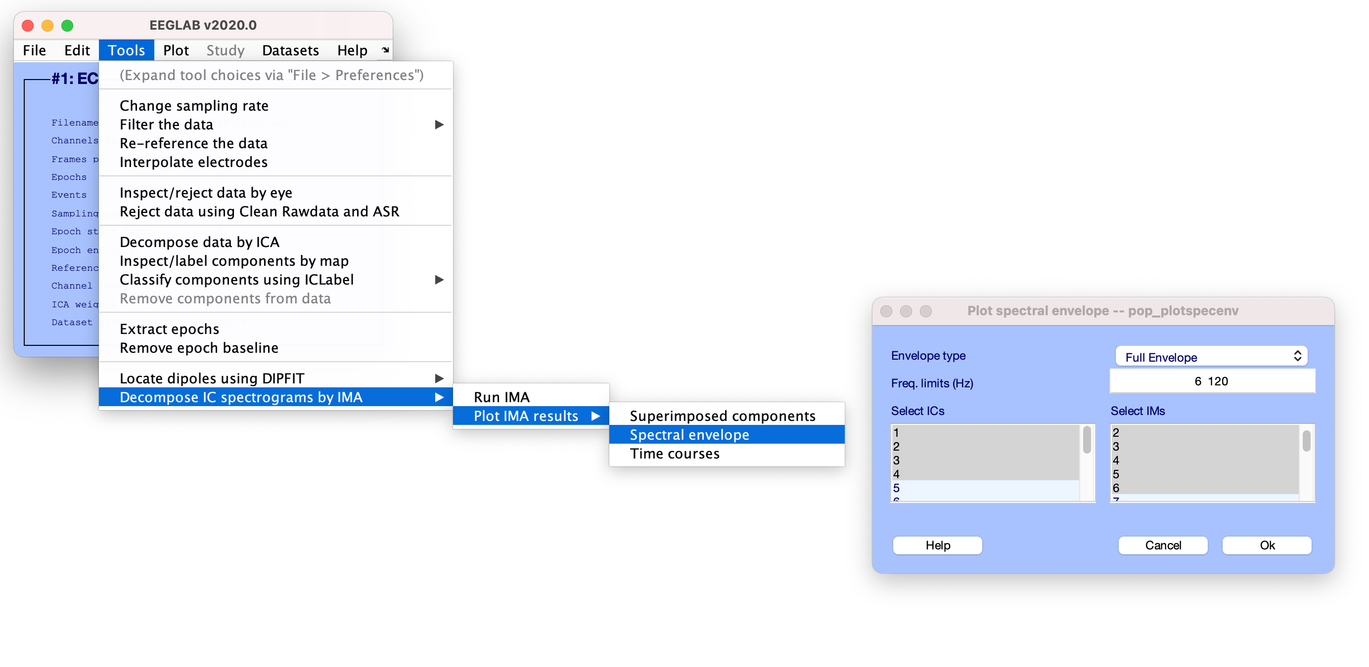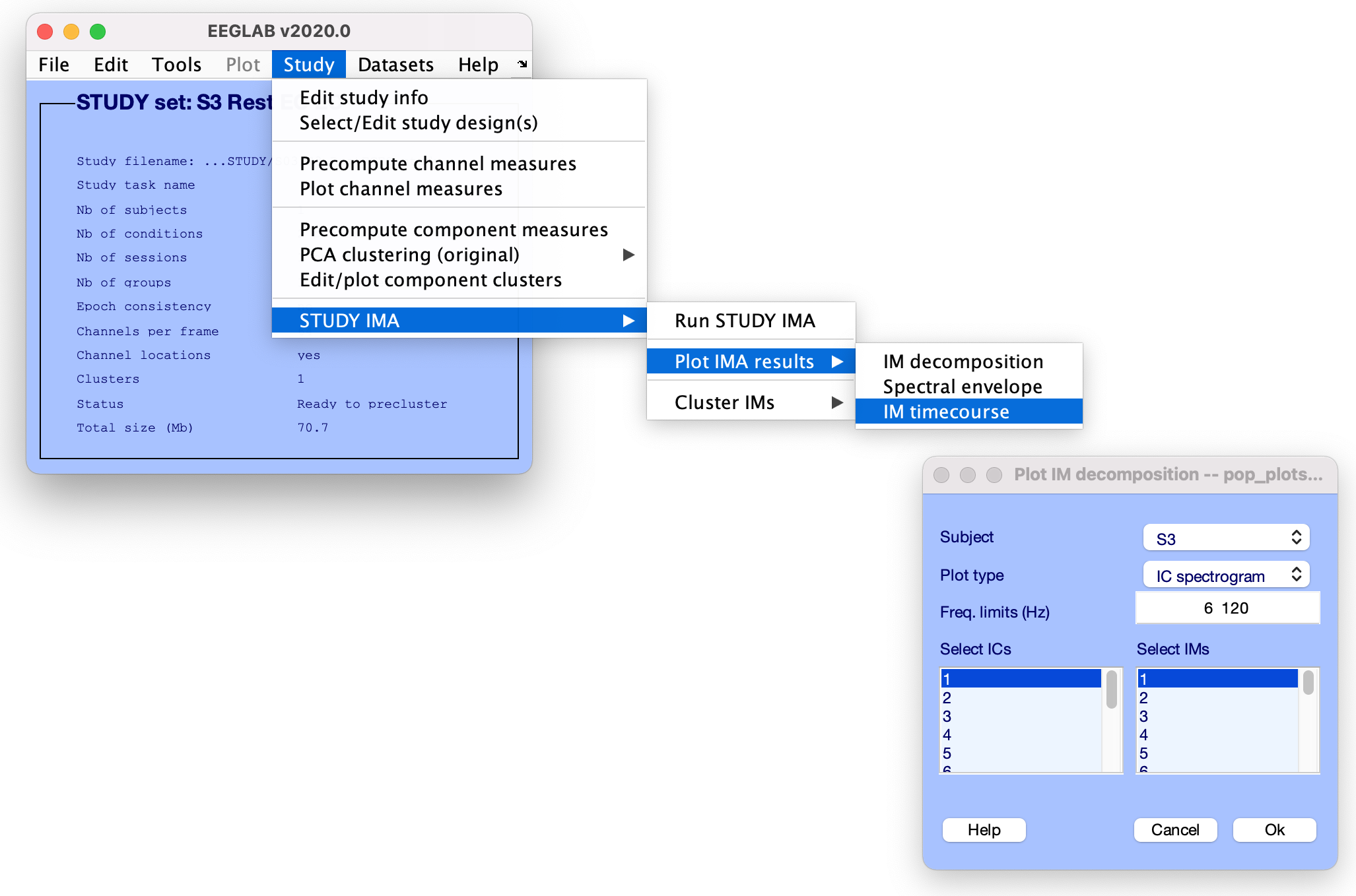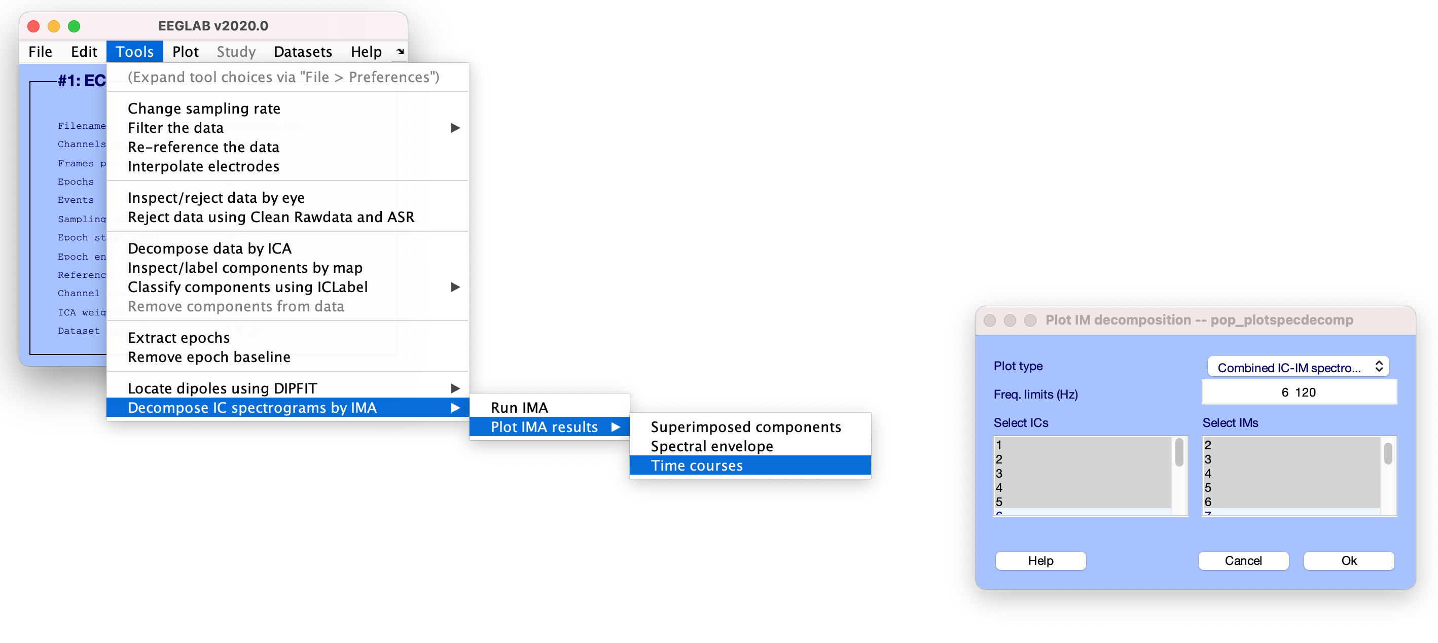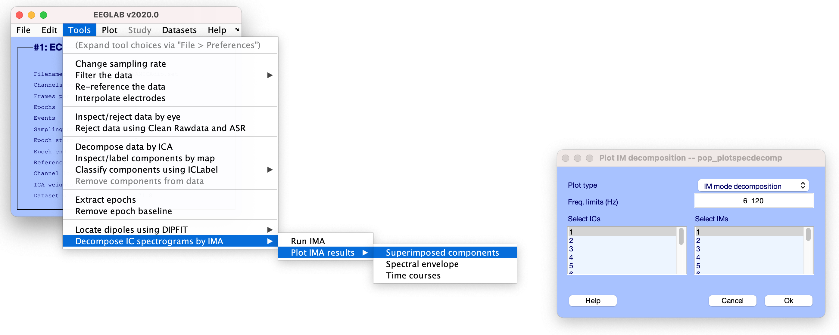 [EEG, IMA] = pop_runIMA(EEG, ‘freqscale’, ‘log’, ‘frqlim’, [6 120], ‘pcfac’, 7, ‘cycles’, [6 0.5], ‘selectICs’, {‘brain’}, ‘icatype’);