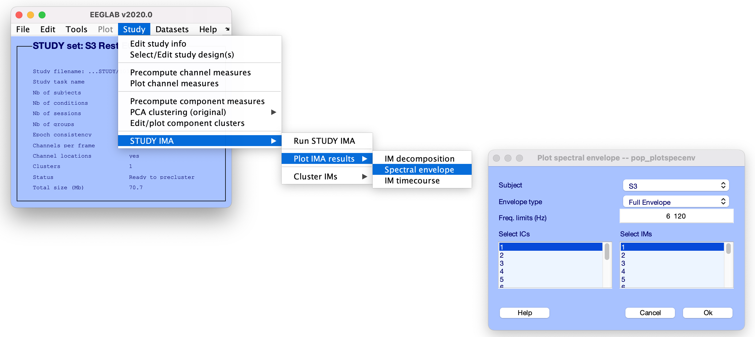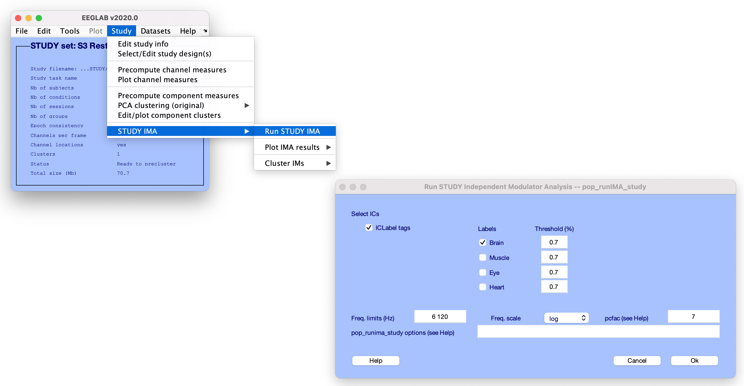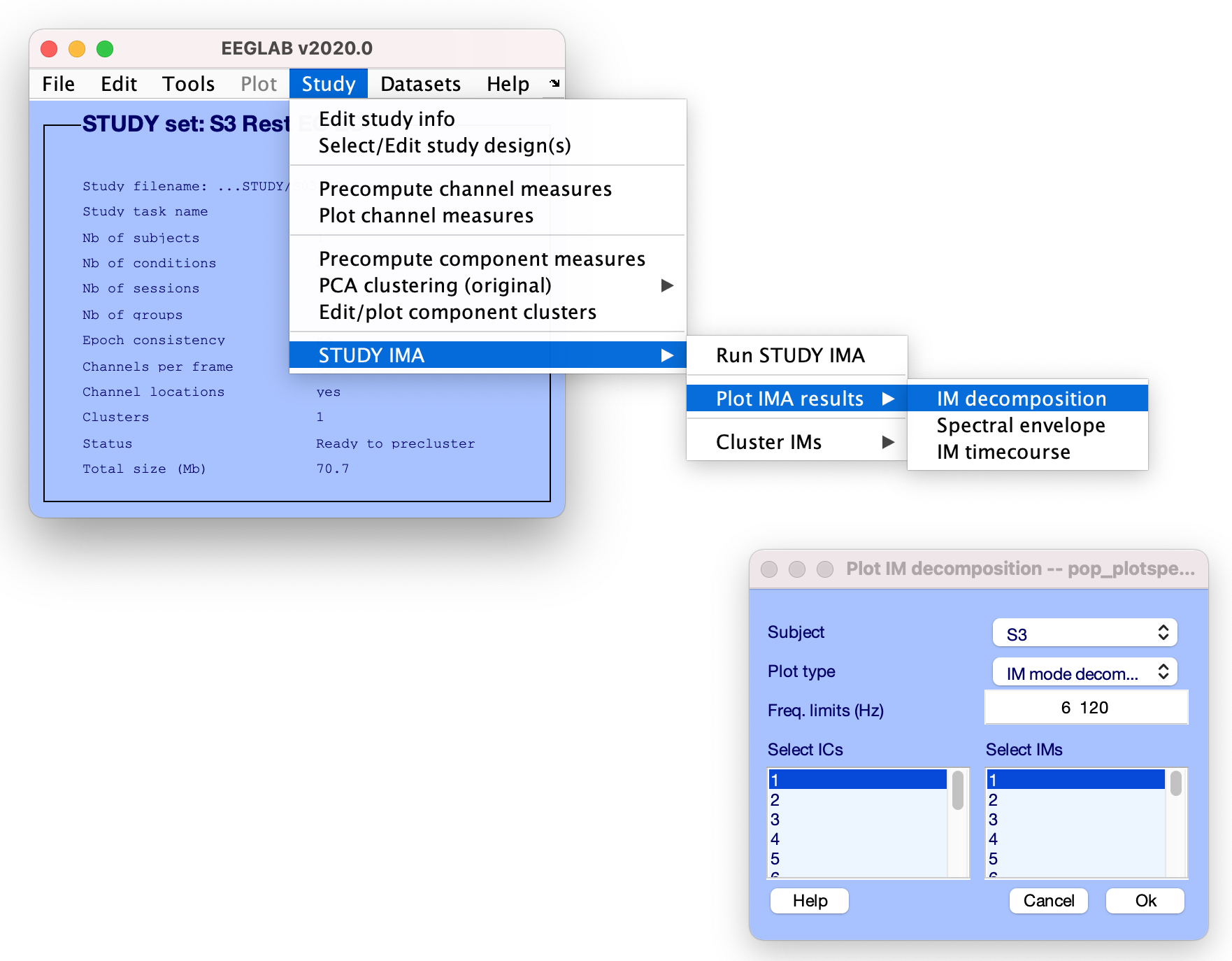 [EEG, IMA] = pop_runIMA(EEG, ‘freqscale’, ‘log’, ‘frqlim’, [6 120], ‘pcfac’, 7, ‘cycles’, [6 0.5], ‘selectICs’, {‘brain’}, ‘icatype’);