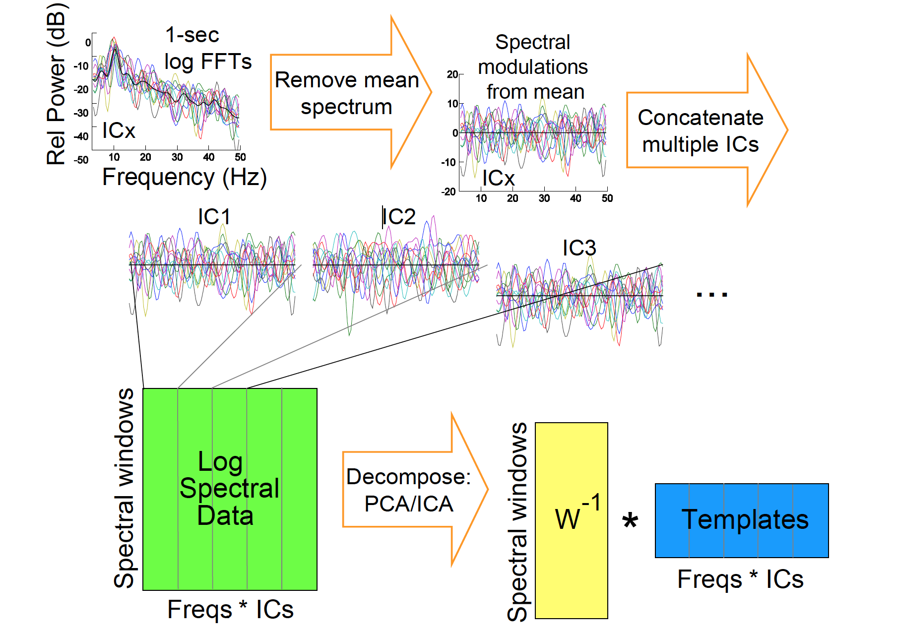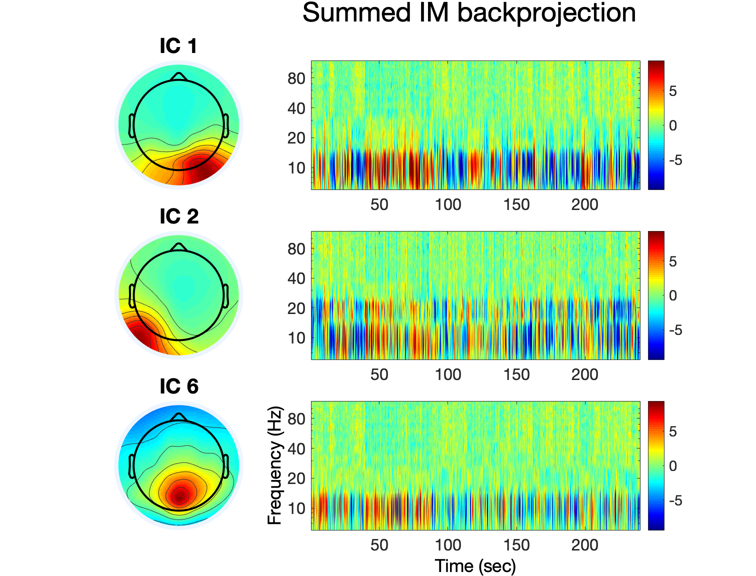 IMA法では、複数のチャネルEEGデータは、独立したコンポーネント分析(ICA)を使用して空間的に安定し、最大に温度の独立したコンポーネント(IC)のソースプロセスに最初に分解されます。 その後、並列ジョイントICログ分光器内の一時的な変動は、最大で独立した(IM)プロセスに分解されます(ソースと周波数の重み)*(下図を参照) Onton & Makeig, 2006年, 2006年, 2006年, 2006年, 2006年, 2006年, 2006年)。 注意: IMA分解では、結果のIMの独立性が最大化されるのは、時間の経過とともに非であるが、ソースと周波数の重みを越える。