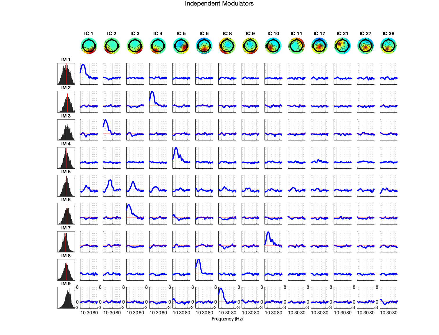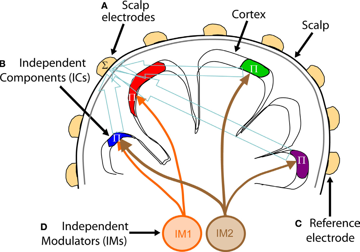 インディペンデント・モジュレータ・アナリシス(IMA)は、「スパティオ・スペクトラム・スペクトラム・モジュレータ・プロセス」に、温かみのある独立したEEGソースのスペクトル変動を分解する方法です。 そのようなプロセスは、コルチコの皮下または感覚的角質ループで生成された変調の影響、またはドパミン、セロトニン、ノラドレナリンなどを使用して脳幹中心のインポート認識システムからシグナル伝達することにより、など、機能的に独立した変調因子の調整から派生する可能性があります。 (以下の図を参照) Onton & Makeig, 2009 _ オントン&メイク)。 1/fベースラインスペクトラム上に重ねられた狭いバンドプロセスを識別するために、コンポーネントプロセスの平均電力スペクトルを分解しようとするよりも、IMATは、時折、スペクトル電力 * variesをスペクトルする特性周波数帯を識別します。 IMAはboth*の狭く、広いバンド モードを見つけることを可能にします。 また、識別されたモードは単数ではありません。 たとえば、IMAは、内因性ベータバンドの変動によるオーバーラップ周波数範囲からのアルファまたはムリズムおよびその調和の関節活動を分離します。 IMAは、脳内でローカライズしたり、特定のスカルプ筋肉など、データ内の独立したコンポーネント(IC)ソースプロセスに適用されます。 IMAは、指定されたIM周波数帯域に連結されたICサブセットを識別します。これらは、共通の影響と感受性を持つコモデーションネットワークとして考えられるかもしれません。