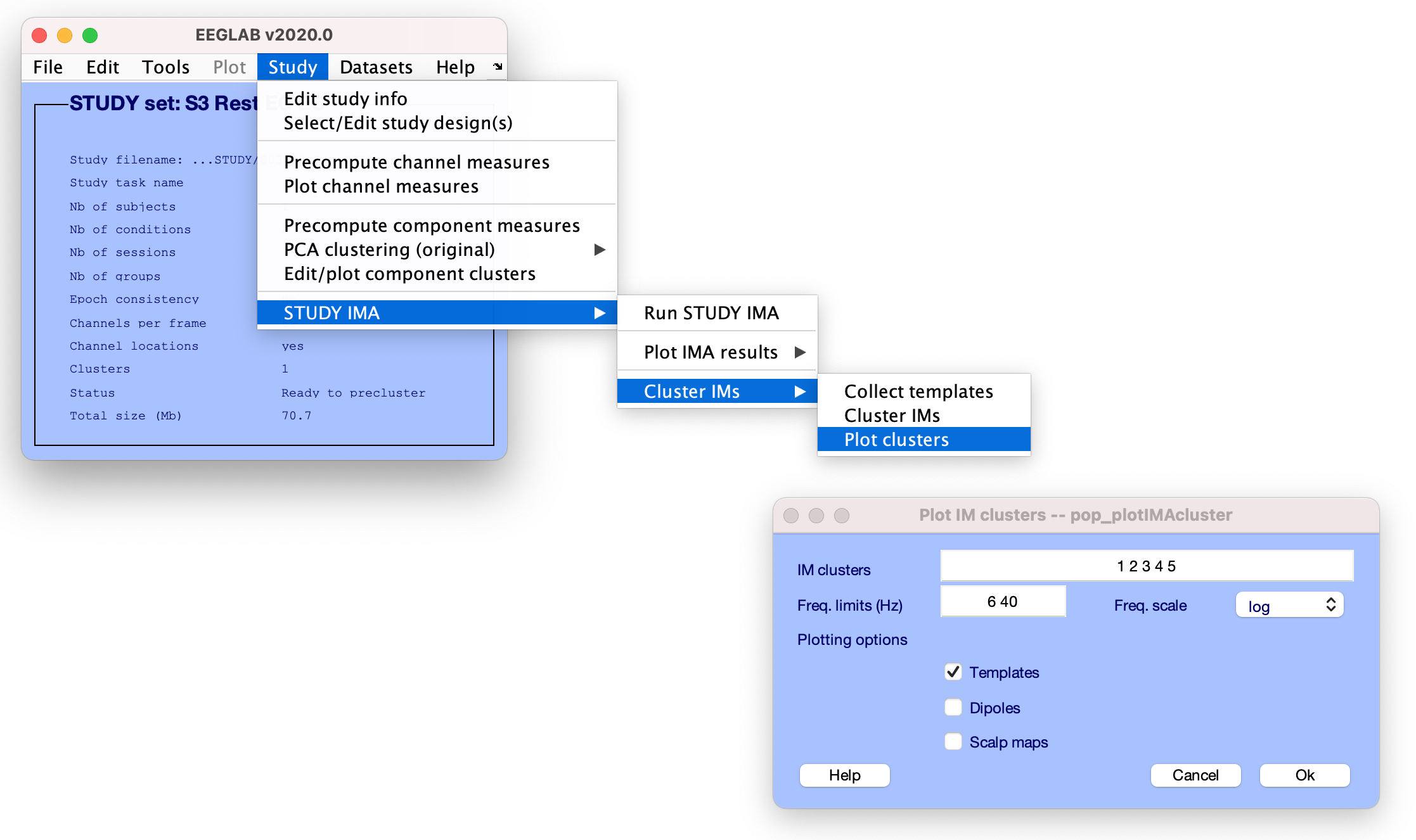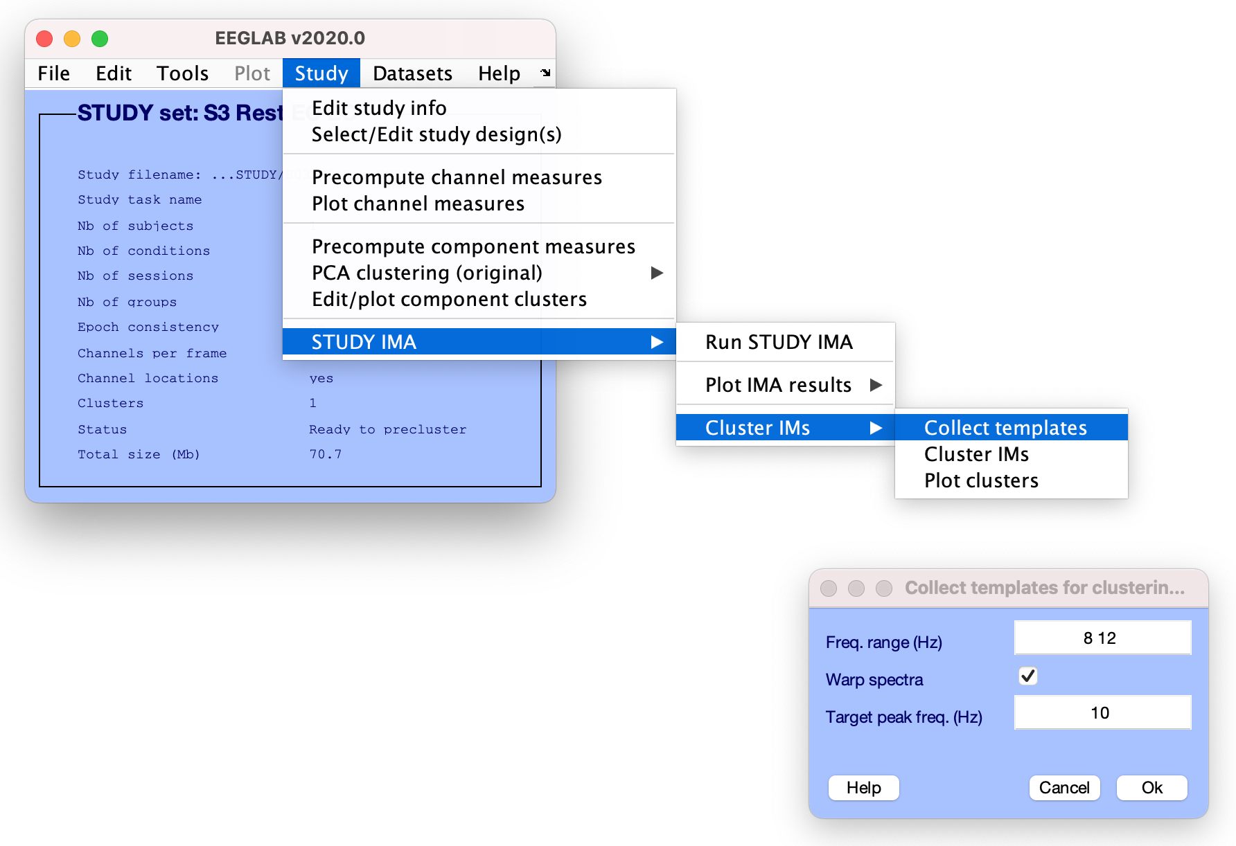 前のステップで収集したIMのスペクトルテンプレートをクラスターするには、**STUDY > を起動します。 STUDY IMA > クラスタ IM > クラスタ メニュー