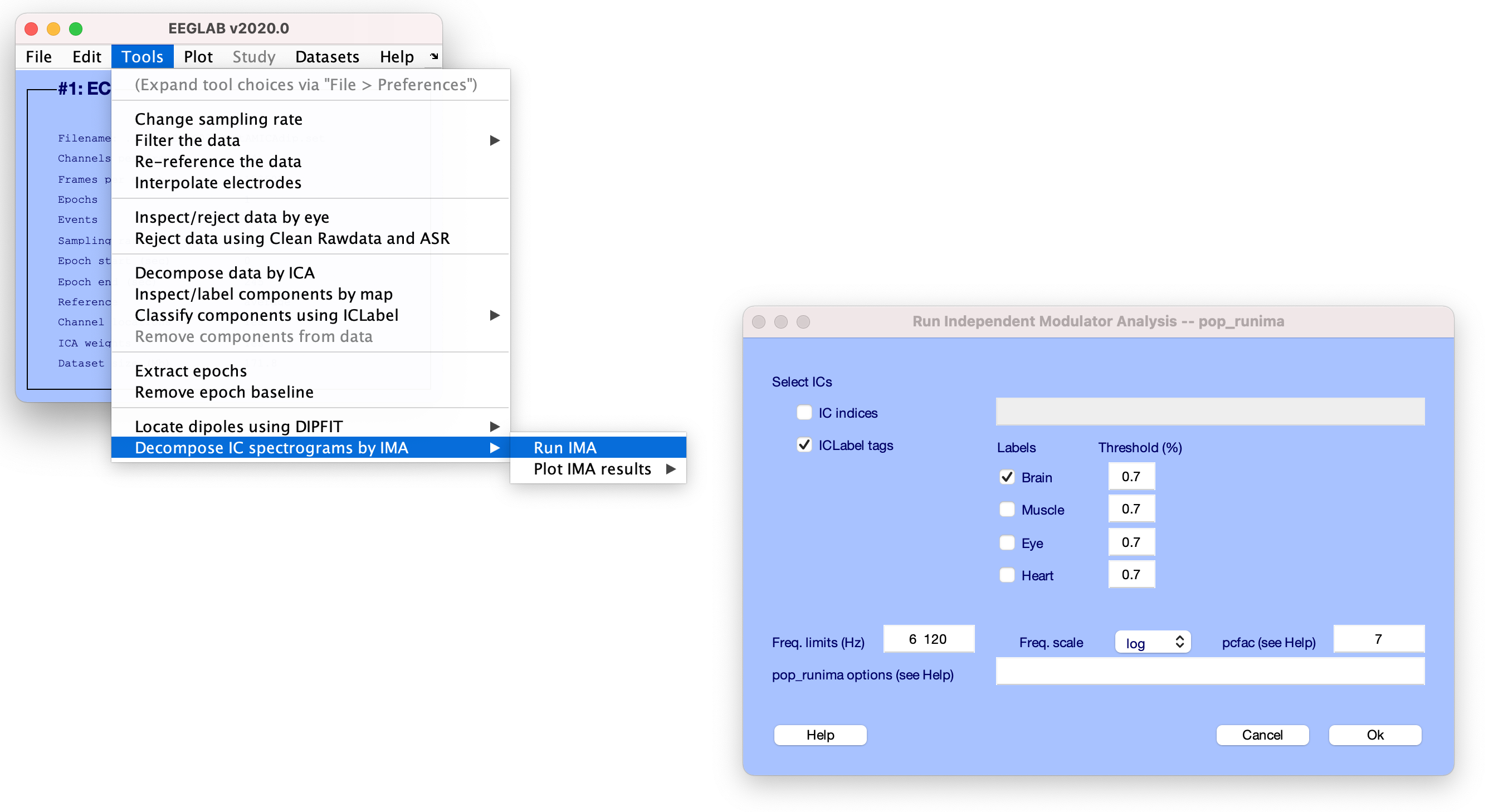 読み込まれたデータセットでIMATを実行するには、MATLABコマンドラインでpop_runIMAを入力するか、EEGLABメニューからそれを呼び出してTools >を選択することにより、実行IMA(pop_runIMA)ウィンドウを起動します。 IMA > IMA を実行し、以下の図で強調表示します。
