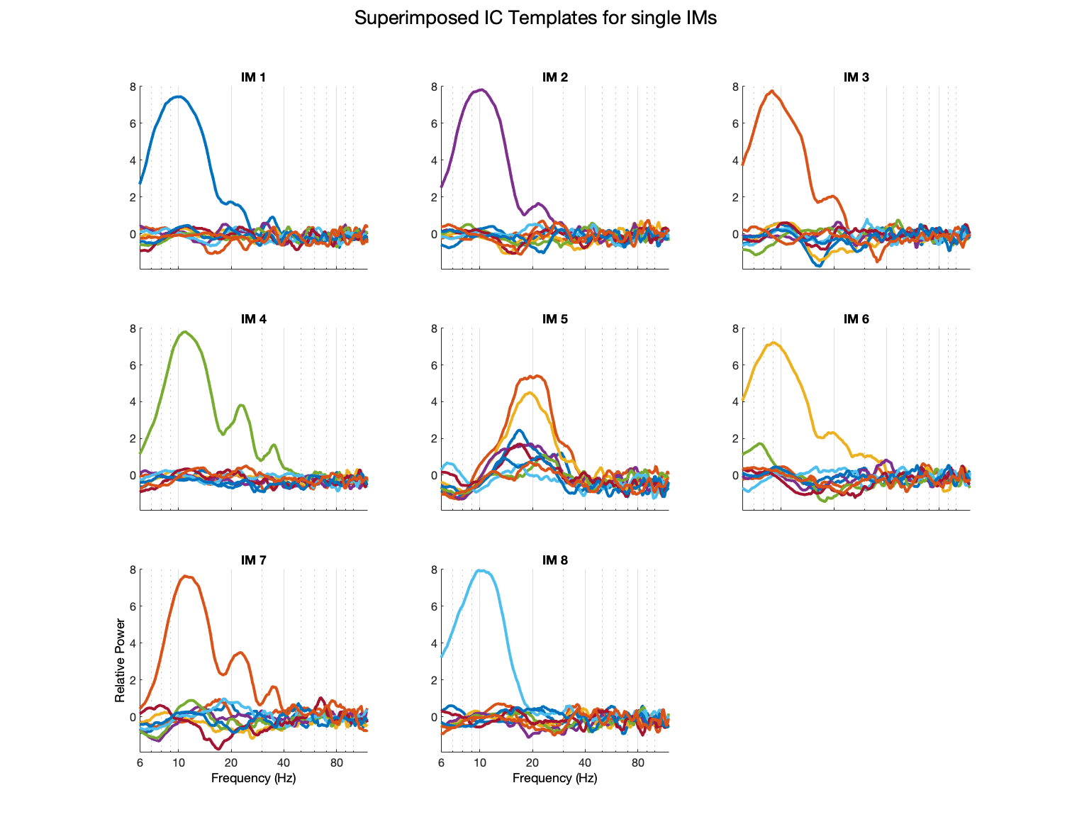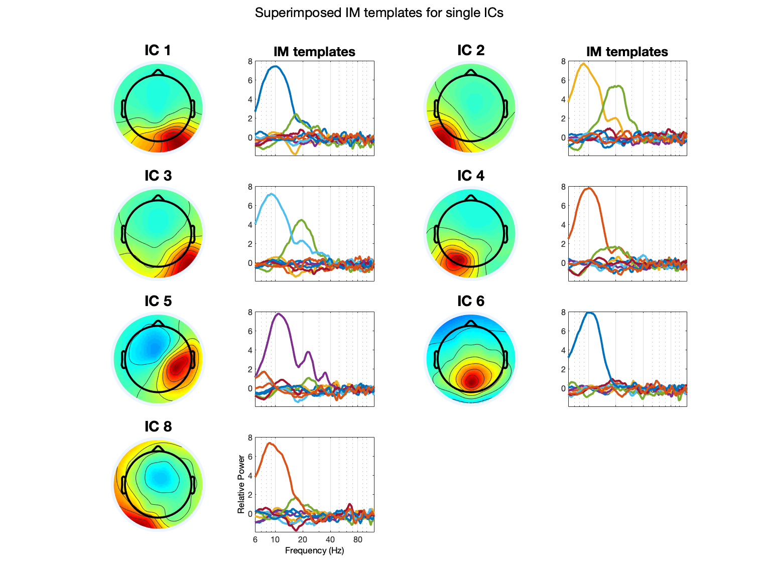 コマンドラインで入力: pop_plotspecdecomp(EEG, ‘plottype’, ‘ics’, ‘comps’, [1:7], ‘factors’, [1:8]