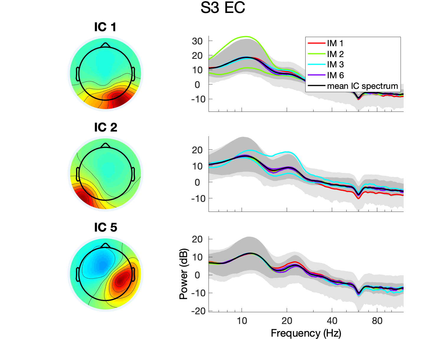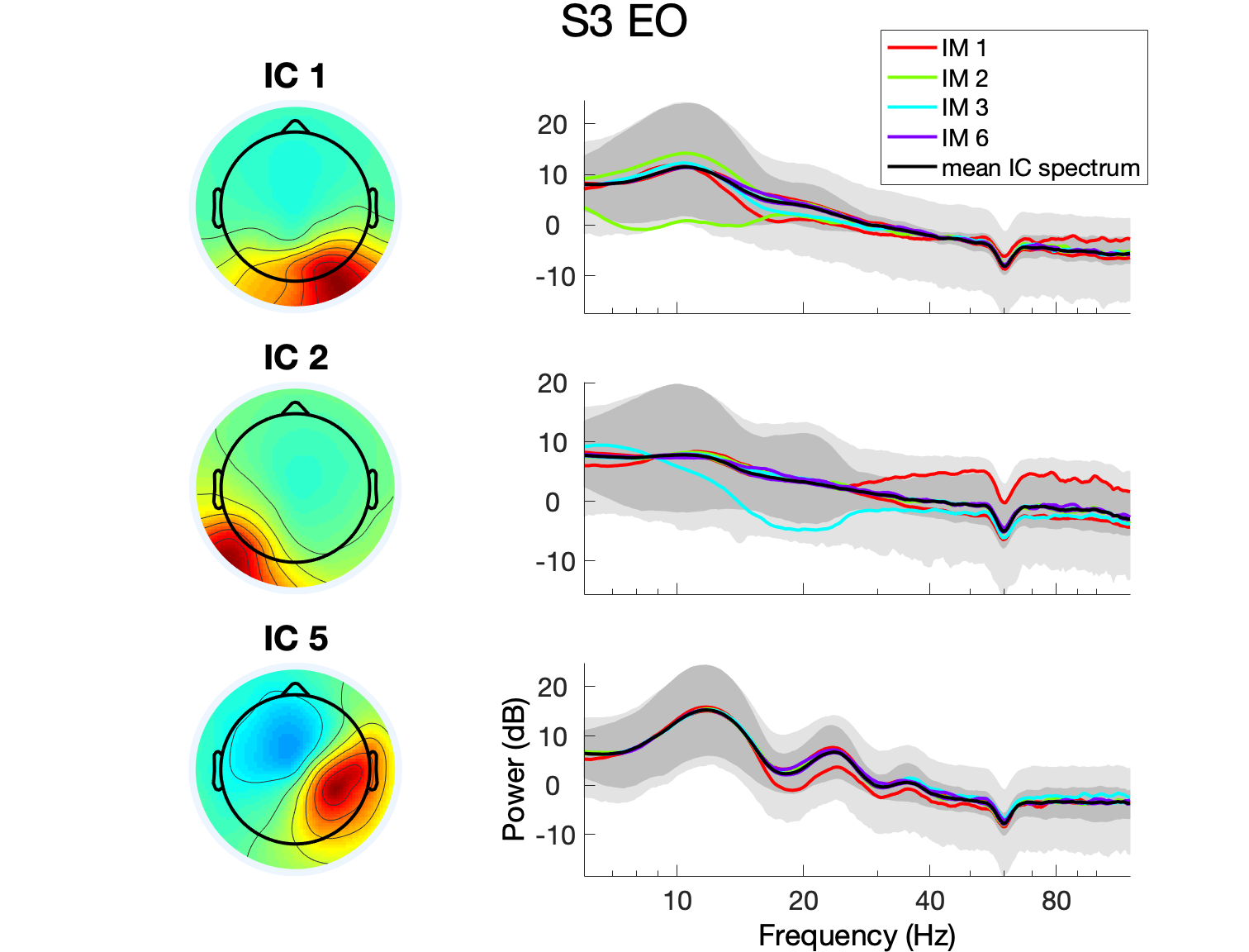 関数は各条件のための別のスペクトルのローディングをプロットします。 ここでは、2つのEyes_openとEyes_closed条件を別々にIMのフルエンベロープをプロットする例です。 IC は、ログ出力スペクトラムを黒のトレースとして示します。 アウターライトグレーの限界は、ICログスペクトルの変動の第1と第99パーセントを表します。 ダークグレーの領域は、IMA解析で使用されているPCA-reduced ICスペクトルデータのための1stと99thのパーセンシーを表しています。