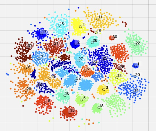 In the figure above, the colored dots are individual bootstrap ICs. Here dot color represents the cluster they belong to. Cluster centroids are represented by dots of the same color, but have a black border, the cluster number indicated next to it. Note the difference in cluster compactness (i.e., IC reproducibility across bootstrap decompositions) of Cluster 2 (center) versus Cluster 14 (right).