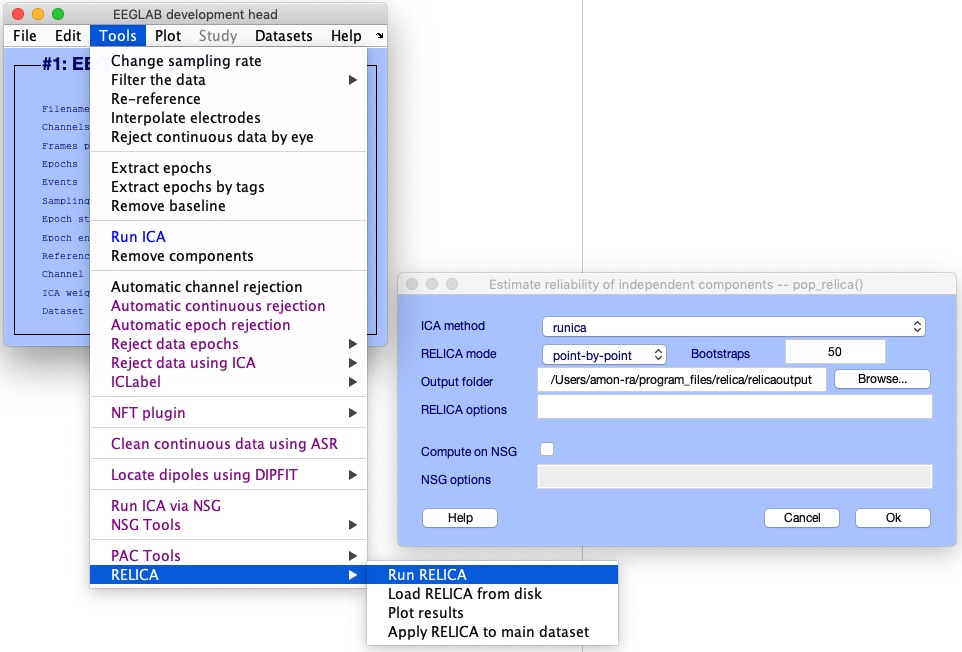EEGLABを再起動します。 インストールが成功すると、RELICA, Tools > Run RELICA を呼び出すメニュー項目が EEGLAB メニューに表示されます。