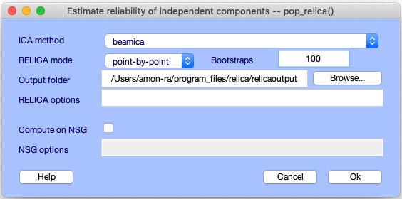 Running RELICA, either locally or using NSG, and retrieving and visualizing the results can also be performed from the MATLAB command line or by a MATLAB script. For syntax of these calls, refer to the help messages for the functions pop_relica.m and pop_relica_results.m.