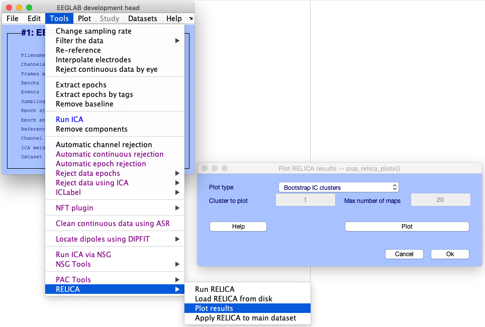 Once the RELICA run is complete and its results retrieved, we can visualize the results by selecting the EEGLAB submenu item ‘Tools > Run RELICA > Plot Results‘. Selecting this menu will launch the pop_relica_plots window (shown in the figure below, right). Here specify the type of plot in the pop_relica_plots window. Three RELICA plot types are available: