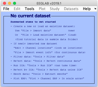 下図の青い EEGLAB メインウィンドウが表示され、7 つのメニュー