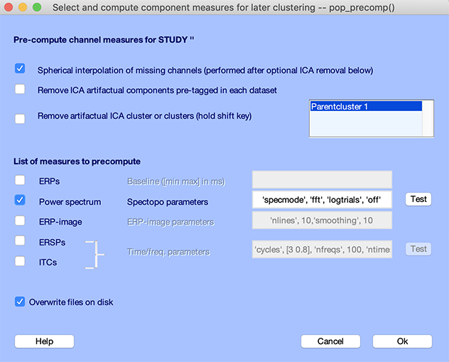 EEGLAB STUDYを使用してチャネル測定値の前処理計算を行うには、研究 → チャネル測定値の前計算 メニュー項目を選択します。以下に示すように、Power のチェックボックスをオンにします。