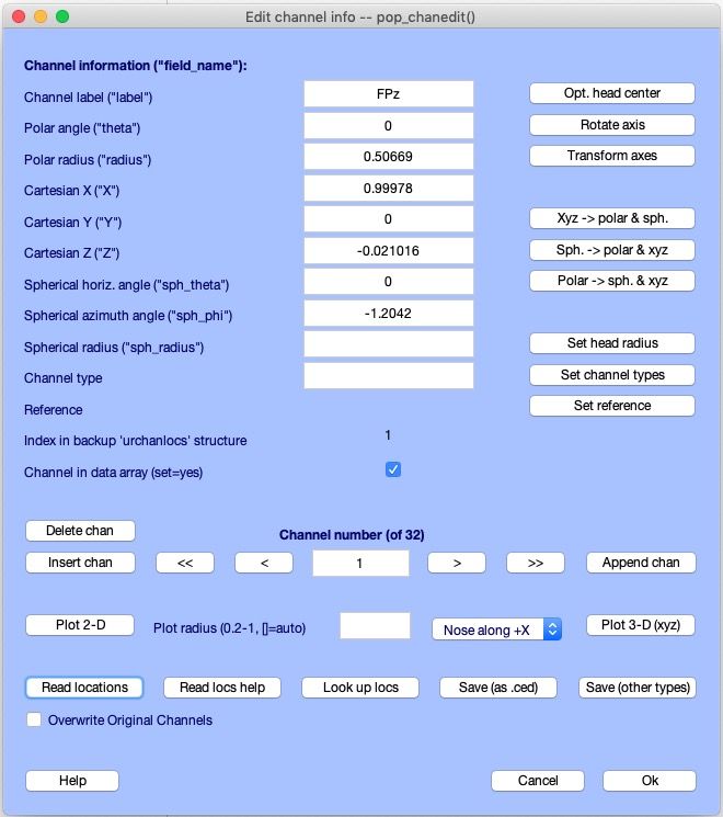 ロードされたチャンネルラベルと座標が pop_chanedit.m ウィンドウに表示されます。チャンネルエディタは極座標、Cartesian座標、球面座標を一貫して保持します。極座標を含むファイルを読み込むと、自動的にCartesianおよび球面座標に変換されます。編集ボックスを使用して手動でチャンネルの座標を変更することもできます。ただし、変更後は他の座標形式も更新する必要があります。例えば、極座標を変更した場合は、右側の polar → s. & xyz 変換ボタン(pop_chanedit.m ウィンドウ参照)を押して、他の座標形式に変換してください。