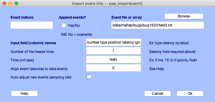チュートリアルテキストファイルのためにブラウズ チュートリアル_eventtable.txtヘッダー行数を 1 に設定します。 (ファイルの最初の行では、列フィールド名を与えます) 入力フィールド(すなわち、列に関連付けられている名前を)設定します。 配列を latency type position に設定します。フィールド名はスペースまたはコンマで区切ります。フィールドのうち2つは latency と type でなければなりません。EEGLABはこれらのフィールドを認識して適切に処理します。MATLABの配列からイベント情報をインポートすることも可能です。 このウィンドウでは、 イベントインデックスとチェックボックス イベントを追加しますか? は、既存のイベントを置換するのではなく新しいイベントを追加するために使用されます。複数のイベントファイルからイベントをインポートする場合に便利です。