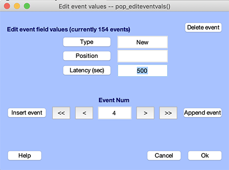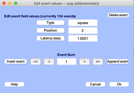 Ok を押すと、EEGLABがテストデータからイベントを抽出します。メニュー項目を選択 編集 → イベント バリュー インポートされたイベントタイプとレイテンシーを検査します。