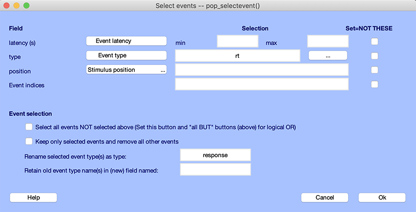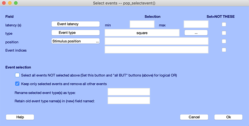 可能です。 チュートリアルデータセット eeglab_data.set を読み込み、編集 → エポックやイベントを選択 メニュー項目を使用します。イベントの選択、除去、名前の変更が可能です。