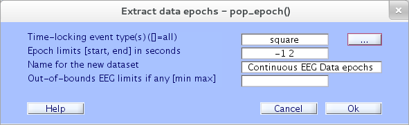 正方形 正方形 * Ok* 選択項目に入力してください。 イベントタイプは、上部のテキストボックスに直接 pop_epoch.m ウィンドウ。