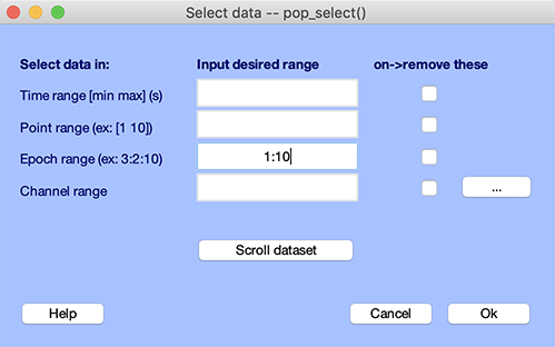 データのエポックを除去する最も簡単な方法は、エポックインデックスを選択することによってです。 これは関数を使って行われます 選択する 選択によって呼ばれる 編集 → データの選択MATLABの名称は、1、2、3、4、5、6、7、8、9、10です。