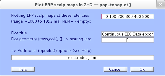 製品のERPデータプロット 選択した一連のトライアルレイテンシーで潜在的な分布。 選択する Plot → ERPMapシリーズ → 2Dで。 結果のトップテキストボックス pop_topoplot.m 関数 ウィンドウ (below)、ERPsカルプマップのエポックレイテンシー。
