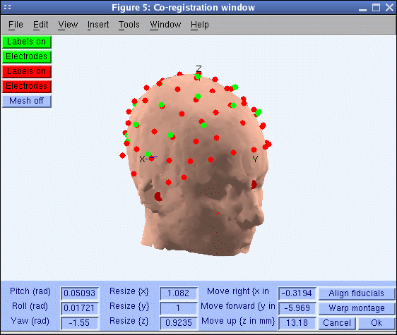 上記のウィンドウでは、赤い電極は、ネイティブに関連付けられている テンプレートヘッドメッシュを使って。 あなたの直接整列よりもむしろ 電極の位置(緑色で表示)、ヘッドメッシュ、モンタージュ 関連する電極の位置をテンプレートに整列する 同じ被写体の頭部のスキャンによるヘッドメッシュ(赤)。 サンプルデータセットの場合、このアライメントは既に実行されています。 (Labels on プッシュボタン、ラベル)