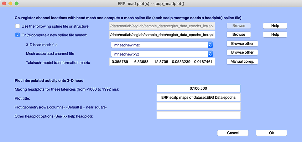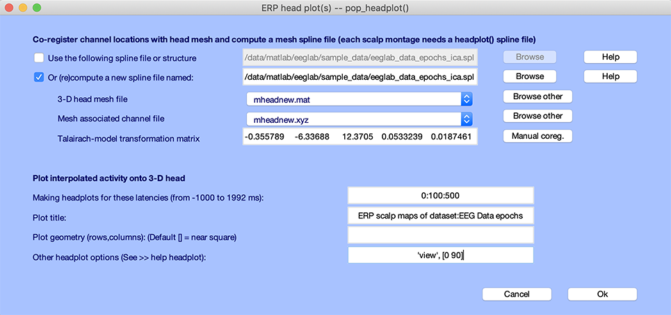 EPOCEANERP は、EPSカルプマップ を、 選択したレイテンシーのスカルプマップを表示するには、 プロット → ERP → スカルプマップを選択します。 サンプルを使ったシンプルな例として dataset は、デフォルトで設定されます。 pop_timtopo.m 関数 下のウィンドウ、および プレス Ok.