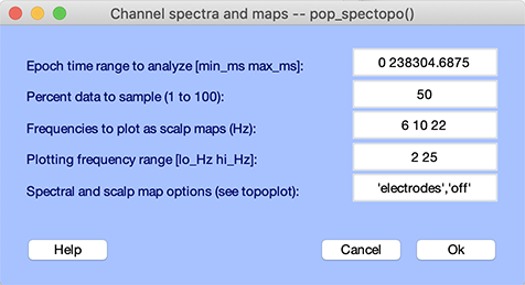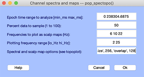 チャンネルのスペクトルと関連するトポグラフィマップをプロットするには、 こちら これはポップアップ表示されます pop_spectopo.m は、 ウィンドウ(下)。 デフォルト設定は、