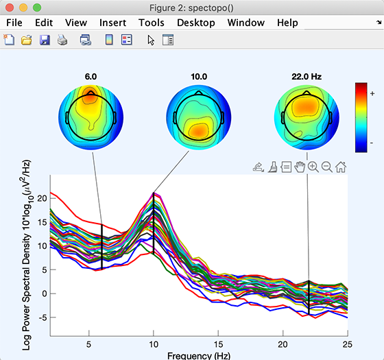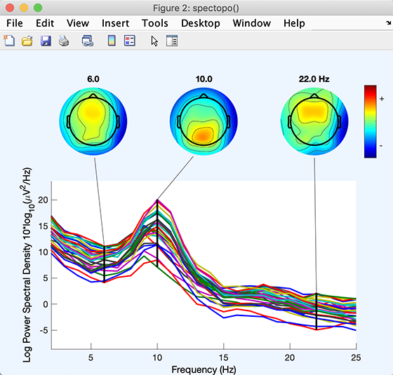 各色のトレースは、1つのデータの活動のスペクトルを表します チャンネル. 左端のスカルプマップは、電力のスカルプ分布を示しています 線 線 線 線 Hzで。 他のスカルプマップ Hz の出力 22の Hz。