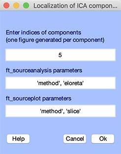 ソースローカリゼーションを実行するには、ツール → DIPFIT → eLoreta メニュー項目を選択します。コンポーネント番号を入力し、Okを押します。