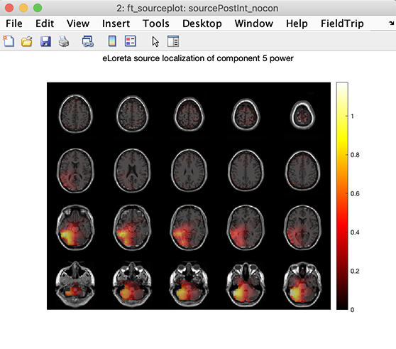 このコンポーネントの結果が示されています ELoreta は、FieldTrip の関数を実装しています。 ソースのローカリゼーション FieldTrip ft_sourceanalysis.m は、