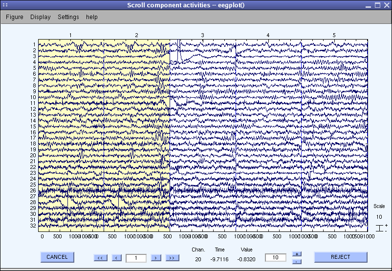 ICAコンポーネントの代表的な検査 選択する Plot → コンポーネントの有効化 (コール pop_eegplot.m )。 を選択します。EEGデータとICAコンポーネントが拒否されていることに注意してください。