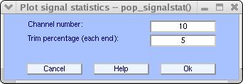 チャネル統計は、チャネルを削除すべきかどうかを判断するのに役立ちます。1つのチャネルの統計特性を計算しプロットするには、メニュー項目 Plot → チャネル統計 を使用します。下のポップアップウィンドウでチャンネル番号を入力します。 パラメータ “トリムパーセンテージ” (デフォルトは5%) は、コンピューティングに使用されます トリミングされた統計(の尾を取除いた後の統計処理) 分布)。 P がこのパーセンテージの場合、 P 条件 1Pのパーセンシャルを上回るバーセンシーは、 トリミングされた統計。