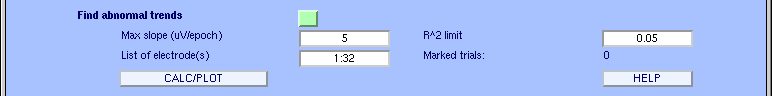 実際の電流は、いくつかの電極で発生する線形漂流を引き起こす可能性があります。 このようなドリフトを検知するため、データに収まる機能を設計しました。 直線線をマークし、斜面が上回る場合除去の試験をマークします 与えられたしきい値。 斜面は全体にわたってマイクロボルトで表現されます epoch (50, epoch に相当する) エポックの開始値と終了値との間に50μVの差がある場合に相当します)。 EEGデータと直線の適合度の最小値(R二乗値)を指定します。 pop_rejtrend.m を呼び出し、および プレス CALC/PLOT