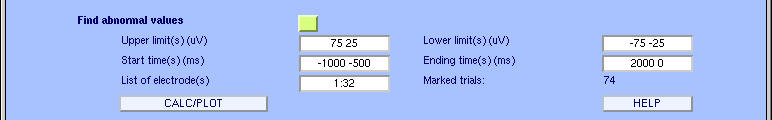 - 異常値* の下の次の値 (これは呼び出します) pop_eegthresh.m 関数 機能)、出版物CALC/PLOT。 変数 EEG 値が +/-75 μV は、EEGLAB に入力してください。 32チャンネル(1:32)のいずれかで、エポック内のいつでも (“-1000”2000 ms)。