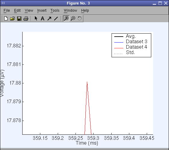 たとえば、上の図では、+記号を持つ拡大眼鏡アイコンを選択します。 その後、下の図のように赤い曲線のピークにズームインします(左マウスボタンを押してズームアウトします)。 ピークレイテンシと振幅を軸スケールから任意の目的の精度に読みます。